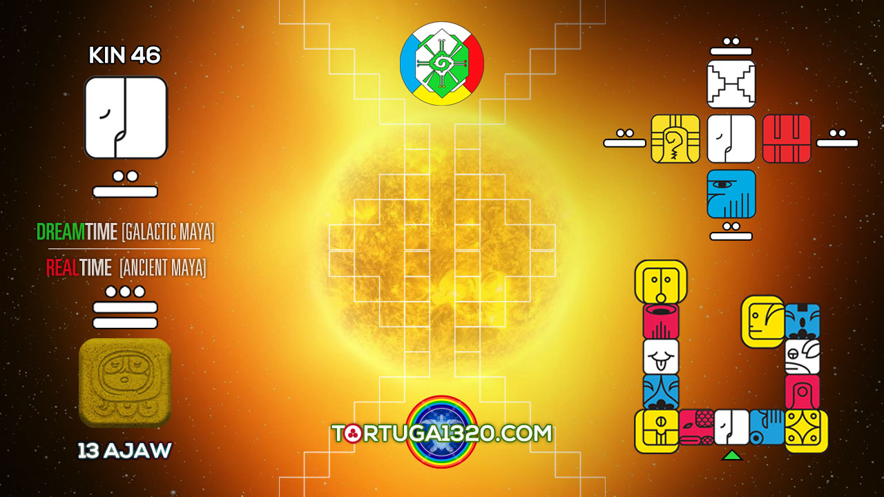 - Kin 46 (Enlazador Resonante). El número 46 refiere a los 46 cromosomas humanos de Padre (23) y Madre (23). Al contener 23+23, el número 46 codifica a los arquetipos progenitores de la Profecía Maya Galáctica, 23 de Valum Votan (en representación de Pacal Votan) y 23 de Bolon Ik (en representación de Bolon Ik). Ellos cumplen sus votos multidimensionales cada Luna en Día 23 que corresponde a la Unidad 23 del Telektonon conocida como la Reunión de Amantes. Ver la Profecía en Tiempo Real y Tiempo del Sueño.