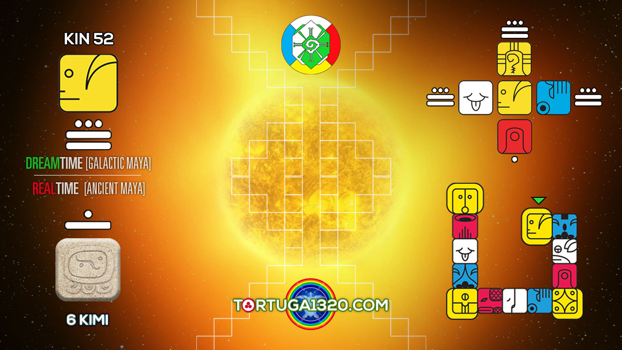 - Kin 52 (Humano Cósmico). El Número 52 contiene 4 veces el Poder del Trece: 4×13 = 52. Por lo mismo, contiene el número total de 52 Kin contenidos en las 4 Ondas Encantadas (4×13= 52) de cada uno de los 5 Castillos de la Cuenta Dreamspell (5×52 = Tzolkin de 260 días). Precisamente, este Kin 52 cierra el primer Castillo Rojo de la Cuenta Dreamspell, un ciclo de 52 Kin. A su vez, el Castillo de Vida también está codificado por el número 52, ya que se requieren de 52 años solares precisos para volver a repetir un Kin de nacimiento en la fecha de cumpleaños (Ciclo de Retorno Galáctico-Solar de 52 años).