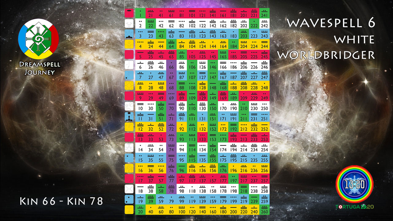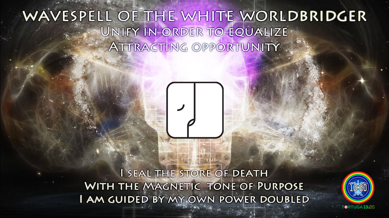 The White Worldbridger Wavespell is the sixth wavespell of the Dreamspell Journey and the second wavespell of the White Northern Castle of Crossing. The bearer of this Wavespell, Kin 66 (Magnetic WorldBridger) encodes 33+33, consequently, it contains the double power of 33. The Worldbridger is Seal number 6 and it also codes the Wavespell number 6, therefore the White Worldbridger Wavespell represents the Power of 6.