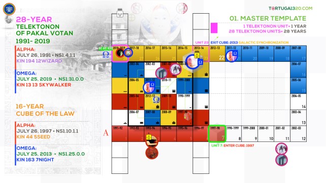- The 28–YEAR Telektonon of Resurrection Cycle (1991-2019). This cycle covered the Dreamspell Years from the Crystal Wizard (12 Wizard – Kin 194 – 26 July 1991) until the Cosmic Moon (13 Moon – Kin 169 – 26 July 2018). This 28-Year Telektonon contained the prophetic 16-Year Telektonon Cube of the Law as the 16-Year Countdown to 2012-2013, presented by Valum Votan and Bolon Ik on the 20 Tablets publication (1997, PAN). This 28-YEAR Telektonon cycle also closed on Day Out of Time 2019, KIN 13 (13.13) the last day of the Cosmic Moon Year.
