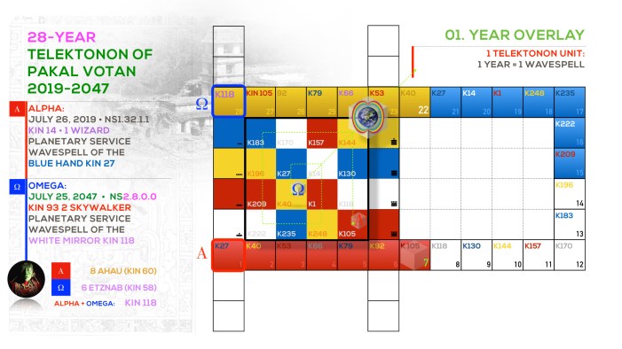 On the 1 KIN = 1 MOON fractal count of 260 MOONS, this OMEGA year (2046-2047) of the New 28-Year Telektonon Cycle will correspond to the Planetary Service Wavespell of the Mirror (KIN 118).