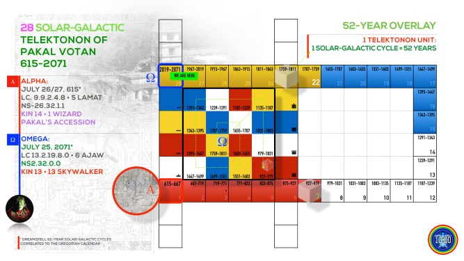 The completion of 27 (26+1) Solar-Galactic Cycles of 52 years each (also known as Sirian Rounds) since Pakal’s accession to power. (27x52=1404). In other words: In 52 years we will complete the prophetic milestone of 28 Solar-Galactic Cycles, and with it a perfect Telektonon Circuit of 28 Sirian Rounds that goes from the year 615 to 2071: