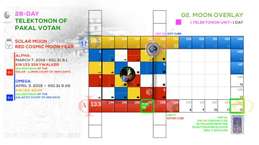 KIN 144 marks the 12th day of this 9th Moon of the Cosmic Moon Year coded by KIN 22 9Wind. As we can appreciate on the Telektonon board for this moon, the 12th position is a PERFECT mirror for the Golden Mean harmonics and Divine Proportions present at the start (ALPHA) and at the end (OMEGA) of the 28-day Telektonon circuit.