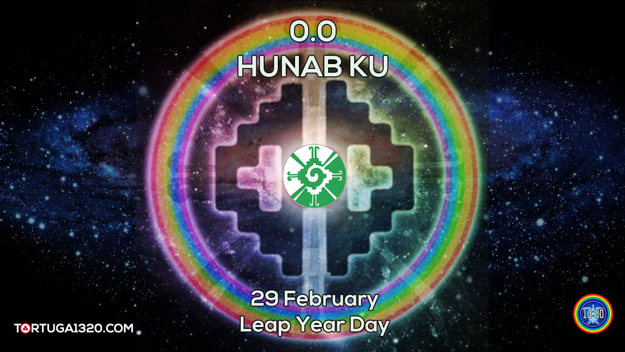 The 0.0 Hunab Ku is the name given to the Gregorian Leap Year Day of 29 February in the 13 Moons / Dreamspell Count, which is not taken into account. Consequently, this Leap Day doesn’t have a Kin, nor a place inside the Calendar of the 13 Moons, but it is instead accounted as 0.0 Hunab Ku.